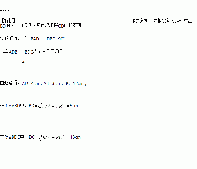 如图,在四边形ABCD中,∠BAD=∠DBC=90°,若AD=4cm,AB=3cm,BC=12cm,求CD的长.
