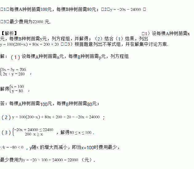 ѧУ¼Æ»®´ÓijÃçľ»ùµØ¹º½øA¡¢BÁ½ÔÛÊ÷Ãç¹²200¿ÃÂÌ»¯Ð£Ô°¡£ÒÑÖª¹ºÂòÁË3¿ÃAÖÖÊ÷ÃçºÍ5¿ÃBÖÖÊ÷Ãç¹²Ðè700Ôª£»¹ºÂò2¿ÃAÖÖÊ÷ÃçºÍ1¿ÃBÖÖÊ÷Ãç¹²Ðè280Ôª£®