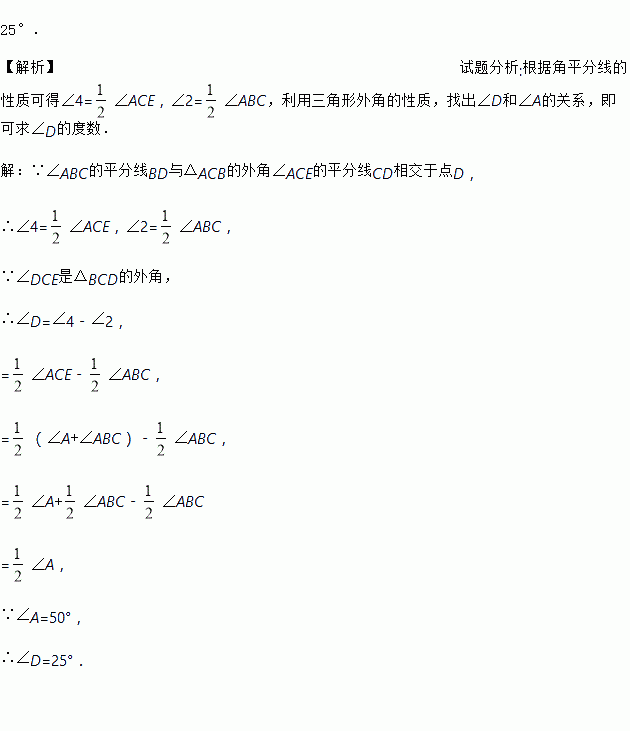 如图,△ABC中,∠A=50°,∠ABC的平分线与∠C的外角∠ACE平分线交于D,求∠D的度数.