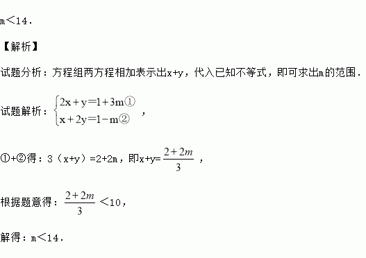 已知关于x、y的方程组的解满足x+y<10,则m的取值范围是 .