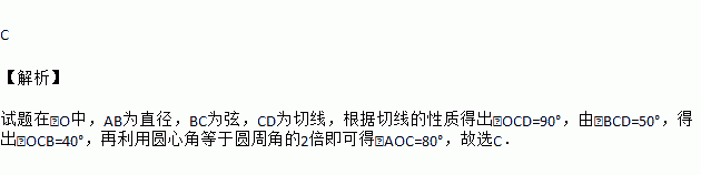 如图,在⊙O中,AB为直径,BC为弦,CD为切线,连接OC.若∠BCD=50°,则∠AOC的度数为( )