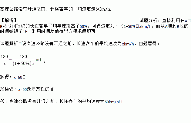 ¸ßËÙ¹«Â·Ã»ÓпªÍ¨Ö®Ç°£¬³¤Í¾¿Í³µµÄƽ¾ùËÙ¶ÈÊÇ60km/h. ¡¾½âÎö¡¿ÊÔÌâ·ÖÎö£ºÖ±½ÓÀûÓÃÔÚA£¬BÁ½µØ¼äÐÐÊ»µÄ³¤Í¾¿Í³µÆ½¾ù³µËÙÌá¸ßÁË50%£¬¿ÉµÃËÙ¶ÈΪ£º£¨1+50%£©xkm/h£¬¶ø´ÓAµØµ½BµØµÄʱ¼äËõ¶ÌÁË1h£¬ÀûÓÃʱ¼ä²îÖµµÃ³ö·½³ÌÇó½â¼´¿É£® ÊÔÌâ½âÎö£ºÉè¸ßËÙ¹«Â·Ã»ÓпªÍ¨Ö®Ç°£¬³¤Í¾¿Í³µµÄƽ¾ùËÙ¶ÈΪxkm/h£¬ÓÉÌâÒâµÃ£º £¬ ½âµÃ£ºx=60£® ¾¼ìÑ飺x=60ÊÇÔ·½³ÌµÄ½â£® ...