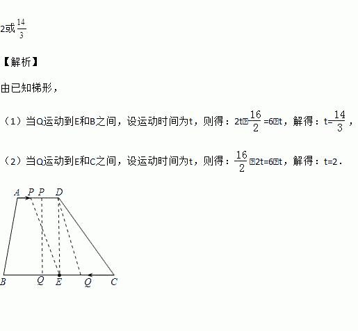 如图,在梯形ABCD中,AD∥BC,AD=6,BC=16,E是BC的中点.点P以每秒1个单位长度的速度从点A出发,沿AD向点D运动;点Q同时以每秒2个单位长度的速度从点C出发,沿CB向点B运动.点P停止运动时,点Q也随之停止运动.当运动时间t= 秒时,以点P,Q,E,D为顶点的四边形是平行四边形.![]()
