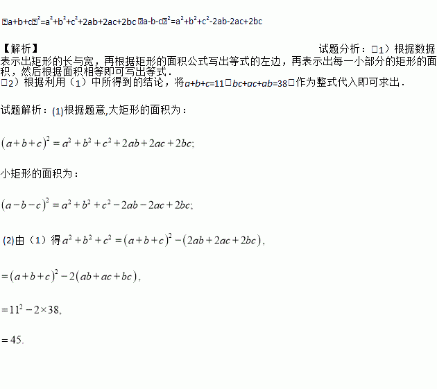 (2)利用上述结论,解决下面问题:已知a+b+c=11,bc+ac+ab=38,求a²+b²+c²的值.