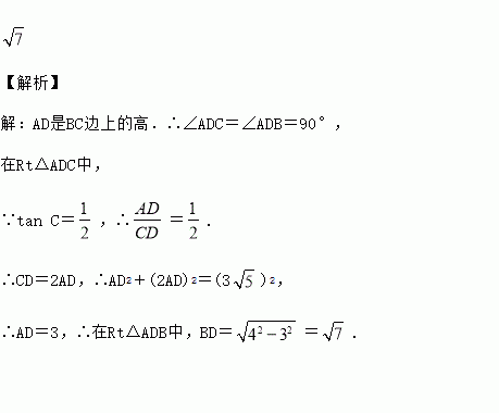 如图,在△ABC中,AD是BC边上的高,tan C=,AC=3,AB=4,求BD的长.(结果保留根号)