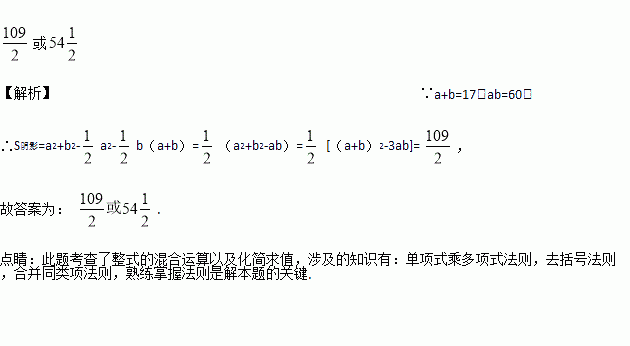 如图,两个正方形的边长分别为a,b(a>b),如果a+b=17,ab=60,则阴影部分的面积是________.