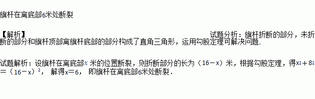 如图,台风过后,一希望小学的旗杆在离地某处断裂,旗杆顶部落在离旗杆底部8米处,已知旗杆原长16米,请你求出旗杆在离底部多少米的位置断裂吗?