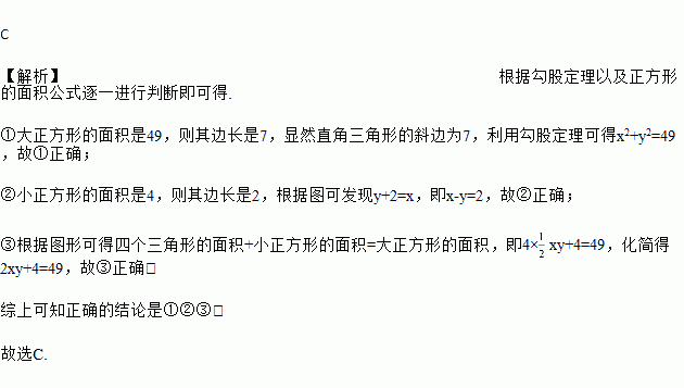 如图是用4个全等的直角三角形与1个小正方形镶嵌而成的正方形图案.已知大正方形面积为49,小正方形面积为4,若用x,y表示直角三角形的两直角边(x>y),下列结论:①x2+y2=49;②x-y=2;③2xy+4=49.其中正确的结论是( )