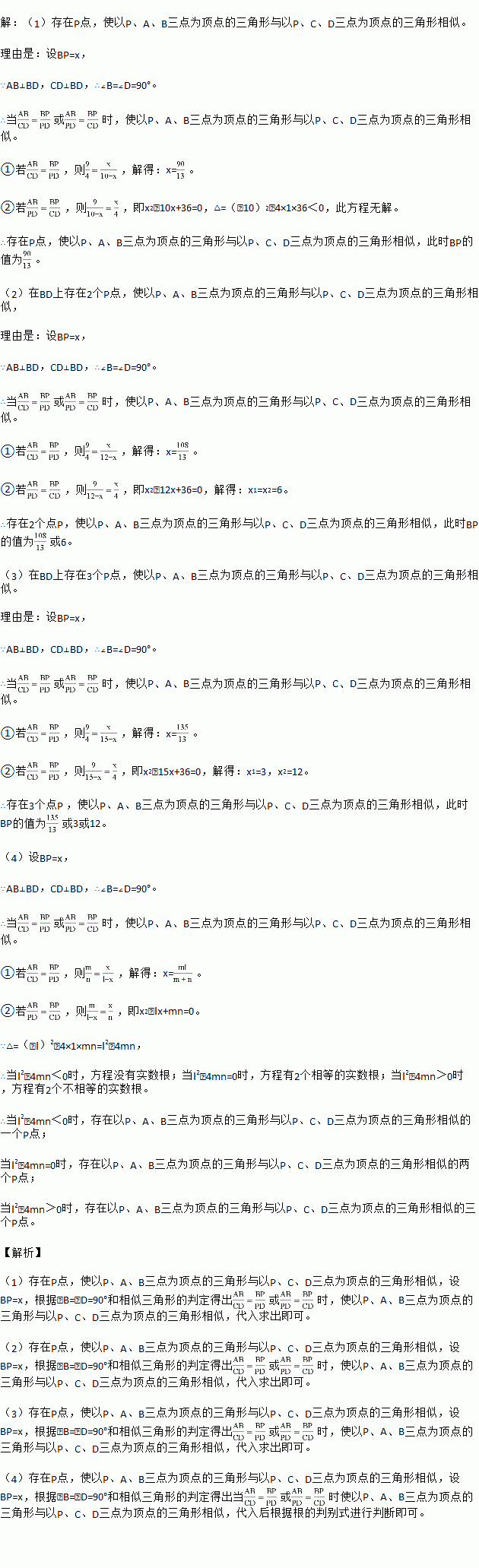 (2)若AB=9,CD=4,BD=12,请问在BD上存在多少个P点,使以P、A、B三点为顶点的三角形与以P、C、D三点为顶点的三角形相似?并求BP的长;