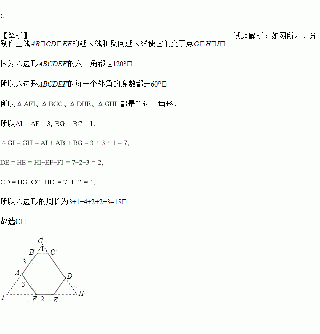 一个六边形的六个内角都是120°(如图),连续四条边的长依次为 1,3,3,2,则这个六边形的周长是( )
