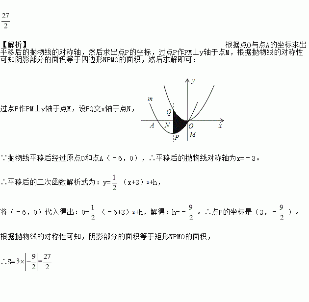 如图,把抛物线y=x2平移得到抛物线m,抛物线m经过点A(﹣6,0)和原点O(0,0),它的顶点为P,它的对称轴与抛物线y=x2交于点Q,则图中阴影部分的面积为 ▲ .