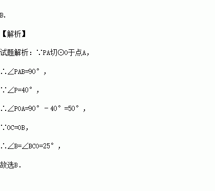 AB是⊙O的直径,PA切⊙O于点A,PO交⊙O于点C;连接BC,若∠P=40°,则∠B等于( )