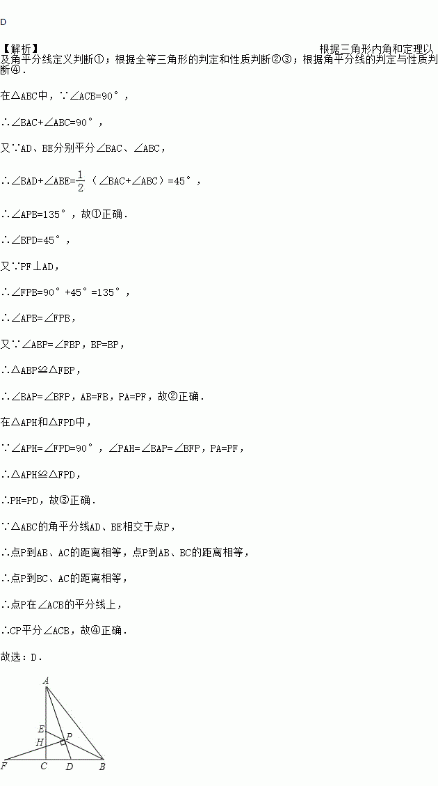 如图,Rt△ACB中,∠ACB=90°,△ABC的角平分线AD、BE相交于点P,过P作PF⊥AD交BC的延长线于点F,交AC于点H,则下列结论:①∠APB=135°;②BF=BA;③PH=PD;④连接CP,CP平分∠ACB,其中正确的是( )