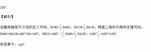 如图,在△ABC中,∠A=800,∠ABC与∠ACB的平分线义交于点O,则∠BOC= 度.