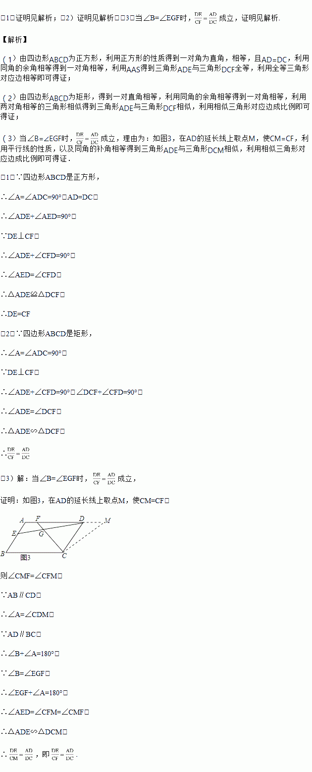 (2)如图2,若四边形ABCD是矩形,且DE⊥CF,求证: