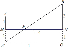 分析:利用数形结合的思想,把x2+1、(4-x)2+4看成是勾股定理的形式,则可作线段MN=4,过A、B两点分别作AM⊥MN,BN⊥MN,使AM=1,BN=2,过点A作关于MN的轴对称点A′,连接AB,交MN于点P,则线段A′B即为所求的最小值,求解即可.