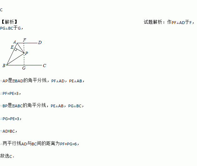 C 【解析】试题解析:作PF⊥AD于F,PG⊥BC于G, ∵AP是∠BAD的角平分线,PF⊥AD,PE⊥AB, ∴PF=PE=3, ∵BP是∠ABC的角平分线,PE⊥AB,PG⊥BC, ∴PG=PE=3, ∵AD∥BC, ∴两平行线AD与BC间的距离为PF+PG=6, 故选C.
