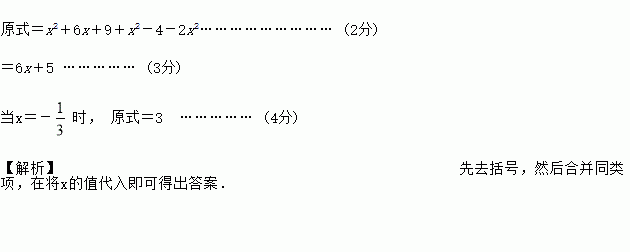 先化简再求值:(x+3)2+(x―2)(x+2)-2x2,其中x=-.