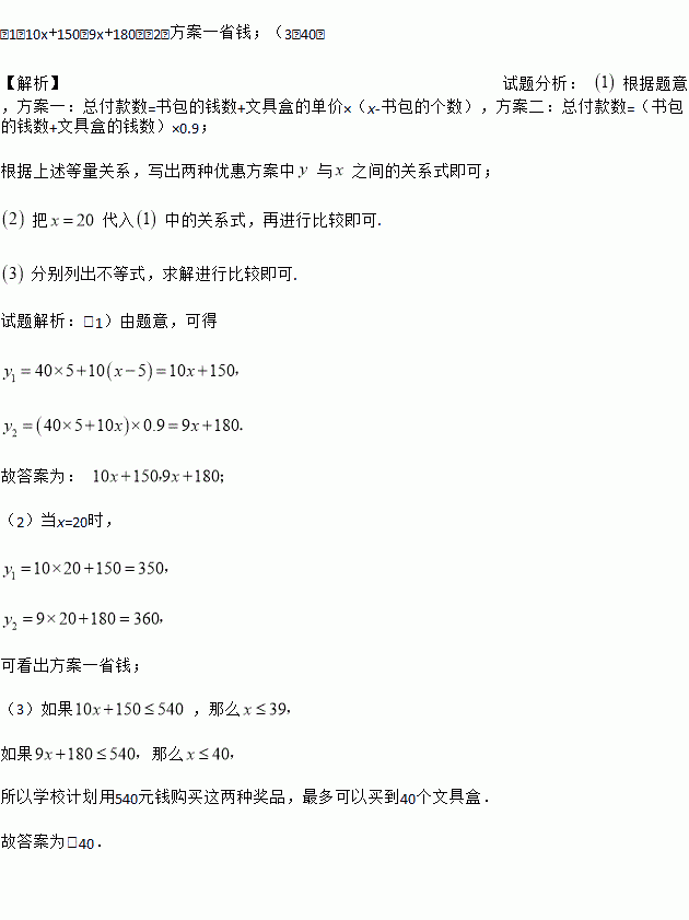 某文化用品商店出售书包和文具盒,书包每个定价40元,文具盒每个定价10元,该店制定了两种优惠方案:方案一,买一个书包赠送一个文具盒;方案二:按总价的九折付款,购买时,顾客只能选用其中的一种方案.某学校为给学生发奖品,需购买5个书包,文具盒若干(不少于5个).设文具盒个数为x(个),付款金额为y(元).