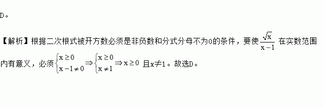 A.x≥0 B.x≠1 C.x>0 D.x≥0且x≠1