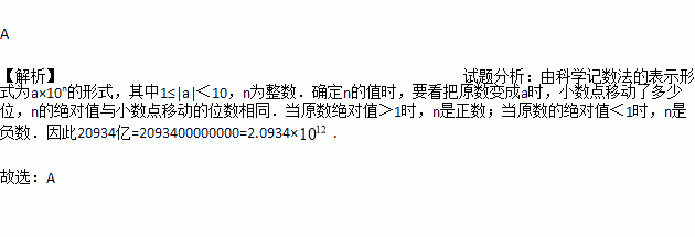 根据有关资料显示,2015年广东省财政收入约为20934亿元,突破2万亿大关,财政支出民生实事类占近七成,数据20934亿用科学记数法表示为( )