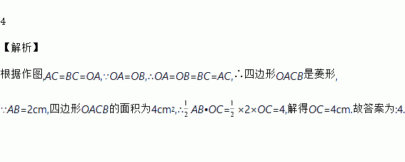 如图,在∠MON的两边上分别截取OA,OB,使OA=OB;分别以点A,B为圆心,OA长为半径作弧,两弧交于点C;连接AC,BC,AB,OC.若AB=2cm,四边形OACB的面积为4cm2,则OC的长为________cm.