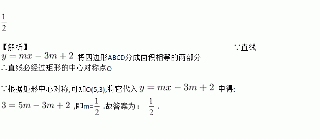 已知平面上四点A(0,0),B(10,0),C(10,6),D(0,6),直线y=mx-3m+2将四边形ABCD分成面积相等的两部分,则m的值为_________.