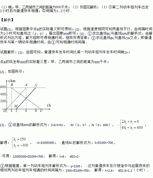 (1)从图象看,普通快车发车时间比第一列动车组列车发车时间 1h(填”早”或”晚”),点B的纵坐标600的实际意义是 ;