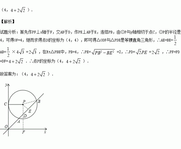 如图,在平面直角坐标系xOy中,⊙P与y轴相切于点C,⊙P的半径是4,直线y=x被⊙P截得的弦AB的长为,则点P的坐标为 .