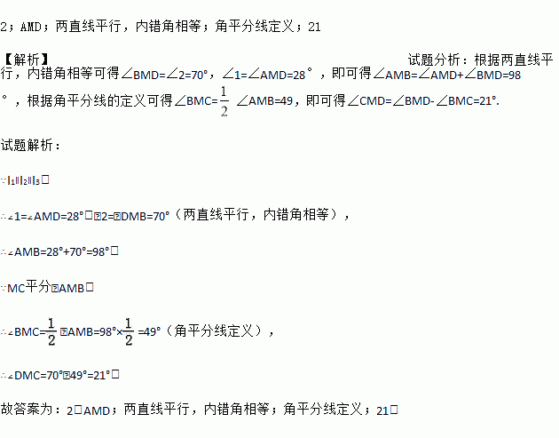 已知:如图1,l1∥l2∥l3,点A、M、B分别在直线l1,l2,l3上,MC平分∠AMB,∠1=28°,∠2=70°.求:∠CMD的度数.