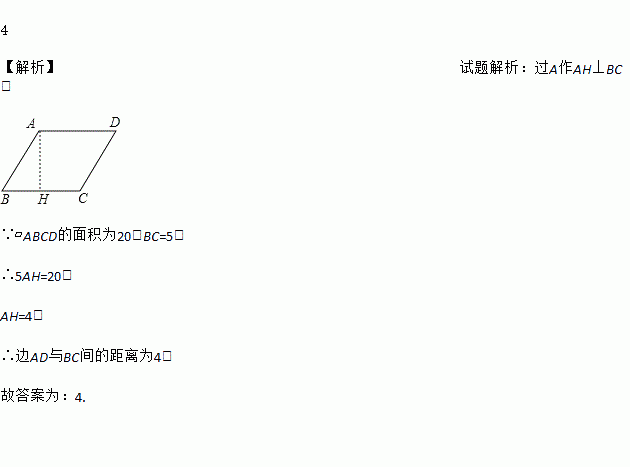 如图,若□ABCD的面积为20,BC=5,则边AD与BC间的距离为_________.