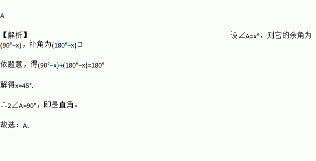 A 【解析】设∠A=x°,则它的余角为(90°?x),补角为(180°?x), 依题意,得(90°?x)+(180°?x)=180° 解得x=45°. ∴2∠A=90°,即是直角。 故选:A.
