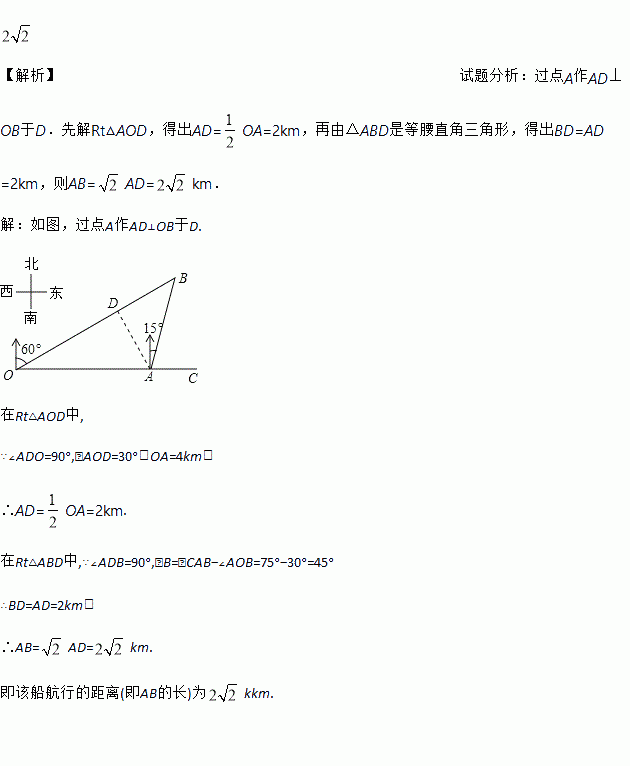 如图,港口A在观测站O的正东方向,OA=4km,某船从港口A出发,沿北偏东15°方向航行一段距离后到达B处,此时从观测站O处测得该船位于北偏东60°的方向,求该船航行的距离(即AB的长).