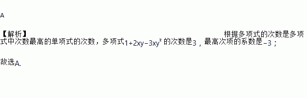 A 【解析】根据多项式的次数是多项式中次数最高的单项式的次数,多项式1+2xy?3xy²的次数是3,最高次项的系数是?3; 故选A.