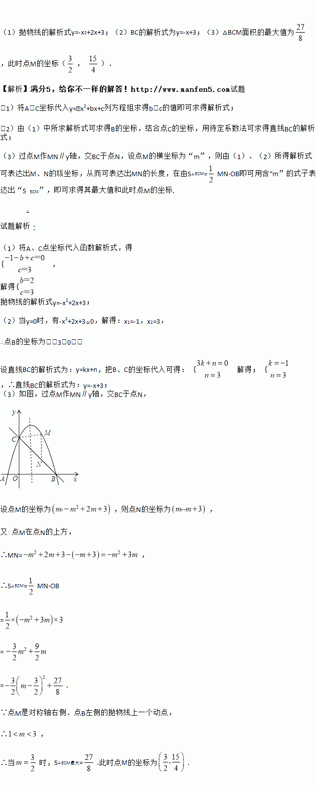 (3)点M是对称轴右侧点B左侧的抛物线上一个动点,当点M运动到什么位置时,△BCM的面积最大?求△BCM面积的最大值及此时点M的坐标.