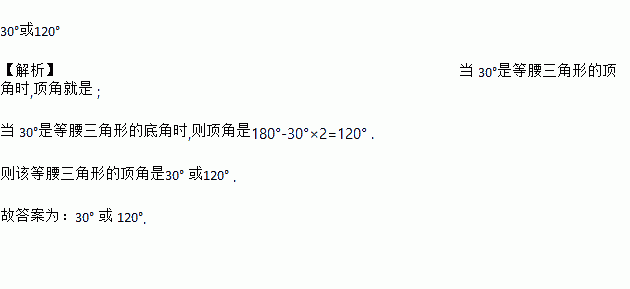 30°或120° 【解析】当 30°是等腰三角形的顶角时,顶角就是 ; 当 30°是等腰三角形的底角时,则顶角是180°-30°×2=120° . 则该等腰三角形的顶角是30° 或120° . 故答案为:30° 或 120°.