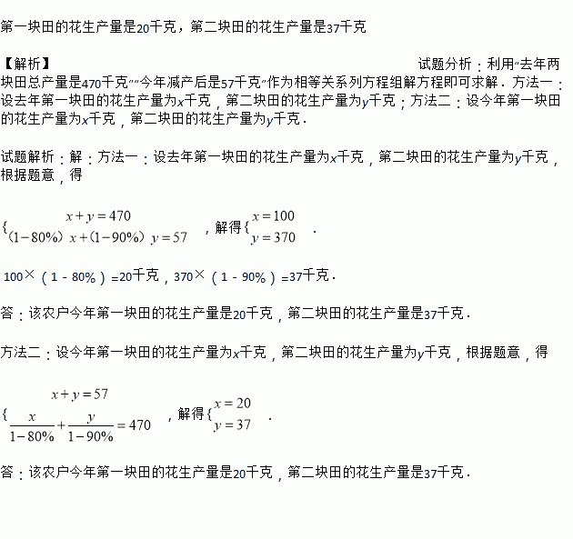 2010年春季我国西南大旱,导致大量农田减产,如图所示是一对农民父子的对话内容,请根据对话内容分别求出该农户今年两块农田的花生产量分别是多少千克?