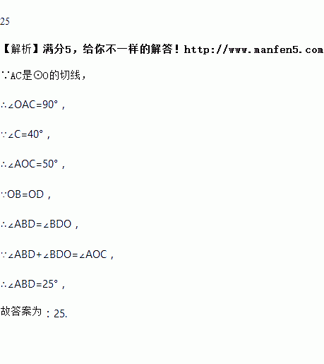 如图,AB是⊙O的直径,AC与⊙O相切于点A,连接OC交⊙O于D,连接BD,若∠C=40°,则∠B=_____度.