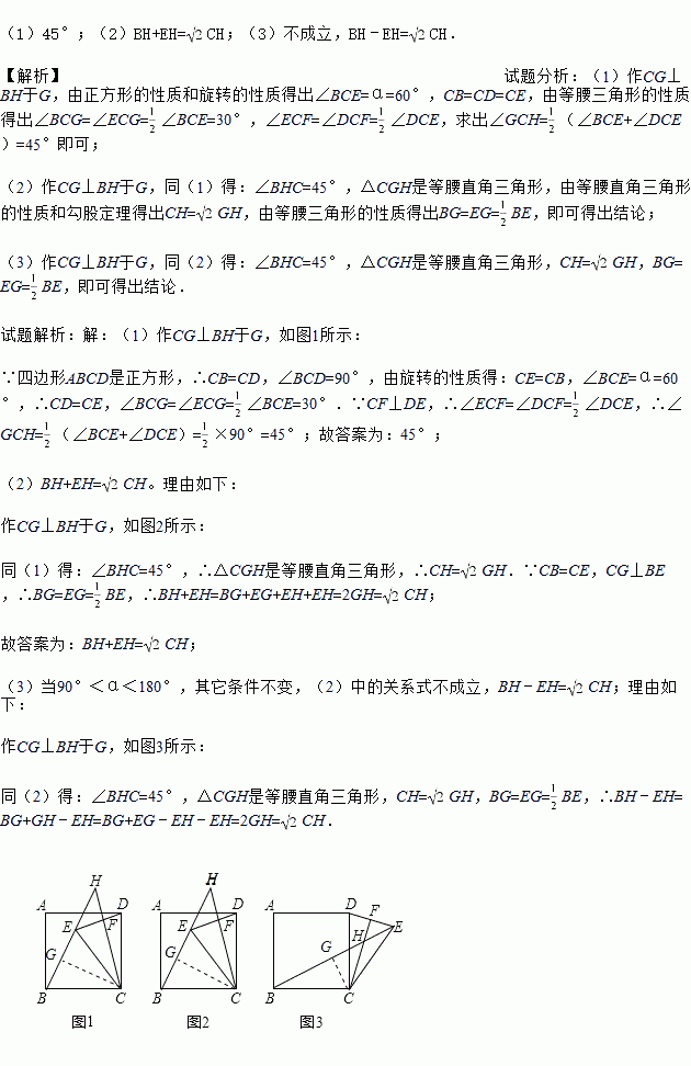 £¨2£©µ±45¡ã£¼¦Á£¼90¡ã£¬Èçͼ2£¬Ïß¶ÎBH¡¢EH¡¢CHÖ®¼ä´æÔÚÒ»ÖÖÌØ¶¨µÄÊýÁ¿¹ØÏµ£¬ÇëÄãͨ¹ý̽¾¿£¬Ð´³öÕâ¸ö¹ØÏµÊ½£º £¨²»ÐèÖ¤Ã÷£©£»