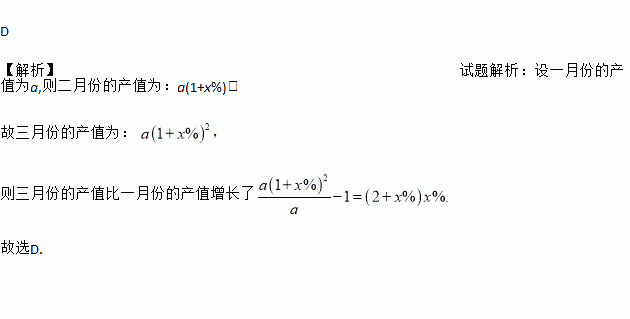 D 【解析】试题解析:设一月份的产值为a,则二月份的产值为:a(1+x%), 故三月份的产值为: 则三月份的产值比一月份的产值增长了 故选D.
