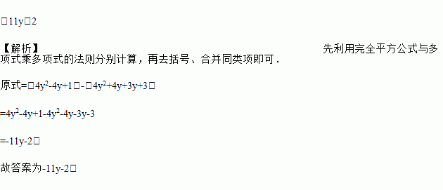 计算(2y﹣1)2﹣(4y+3)(y+1)的结果为________.