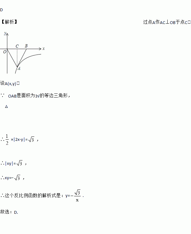 如图,已知点A在反比例函数y=的图像上,点B在x轴的正半轴上,且△OAB是面积为的等边三角形,那么这个反比例函数的解析式是( )