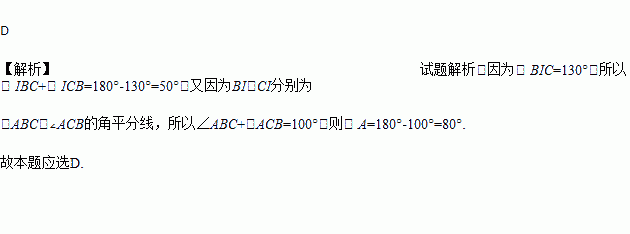 △ABC中,∠ABC与∠ACB的平分线相交于I,且∠BIC=130°,则∠A的度数是( )