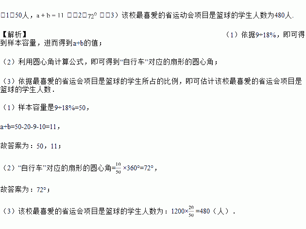 (3)若该校有1200名学生,估计该校最喜爱的省运会项目是篮球的学生人数.