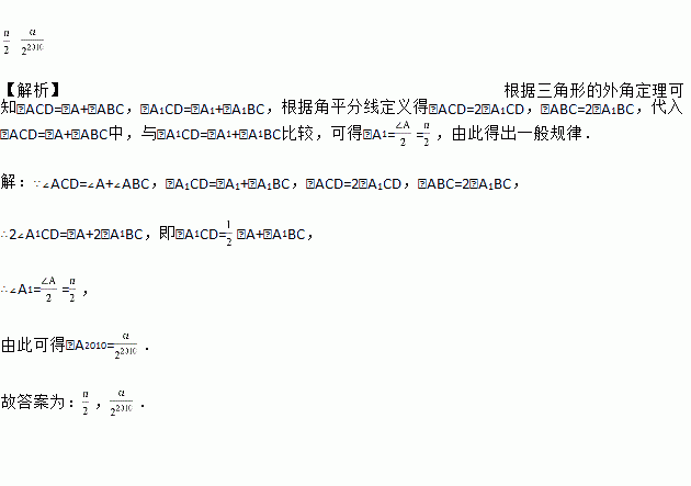 如图,在△ABC中,∠A=α,∠ABC的平分线与∠ACD的平分线交于点A1,得∠A1,则∠A1=_____.∠A1BC的平分线与∠A1CD的平分线交于点A2,得∠A2,…,∠A2009BC的平分线与∠A2009CD的平分线交于点A2010,得∠A2010,则∠A2010=_____.