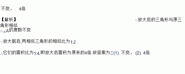 若用一个2倍放大镜去看△ABC,则∠A的大小(_______);面积大小为(______)