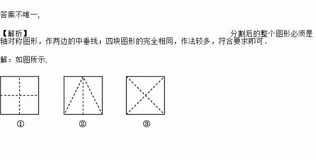 请你按照上述两个要求,分别在图①,②,③中的正方形中画出3种不同的分割方法.(不写画法)