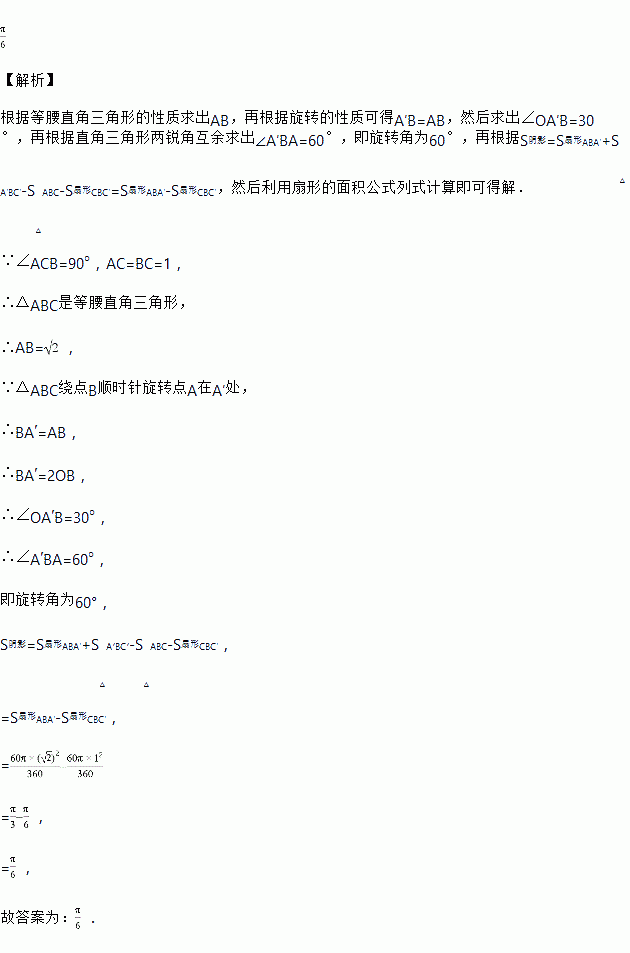 如图所示,在中,,,在以AB的中点O为坐标原点,AB所在直线为x轴建立的平面直角坐标系中,将绕点B时针旋转,使点A旋转至y轴的正半轴上的A处则图中阴影部分的面积为______