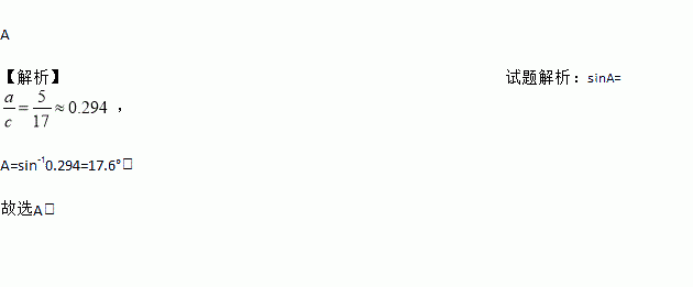 在△ABC中,∠C=90°,a=5,c=17,用科学计算器求∠A约等于 ( )