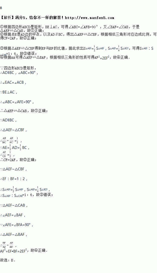 如图,在矩形ABCD中,E是AD边的中点,BE⊥AC,垂足为点F,分析下列四个结论:①△AEF∽△CAB;②CF=2AF;③S△AEF:S△CAB=1:4;④AF2=2EF2.其中正确的结论有( )